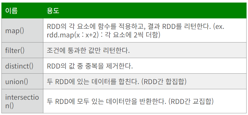 Transformation 연산자는 기존 RDD에서 새로운 RDD를 생성하는 동작이다.