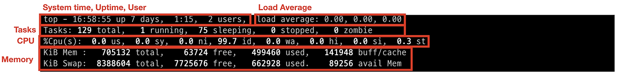 요약 영역은 top에서 상단에 위치하고 있습니다. 이 요약영역은 전체 프로세스가 OS에 대해서 리소스를 어느정도 차지하고 있는지를 알려줍니다. 요약 영역에 나타나는 대표적인 값은 시간, 유저, 로드 에버리지(Load Average), 테스크(Tasks), CPU, 메모리(memory)로 아래의 이미지를 보시면 각 영역에 대해 나태내느 값이 어디에 위치하는지 알 수 있습니다.