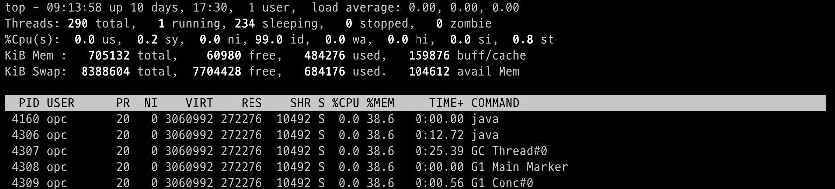 top 명령어는 현재 OS의 상태를 나타내주는 CLI 어플리케이션입니다. 메모리 사용량, CPU 사용량 등을 나타내주며 top를 실행하는 동안에는 주기적인 업데이트로 실시간에 근접한 내용을 보여줍니다. 리눅스에서 top 명령어를 실행하면 아래와 깉이 노출됩니다. 위에는 전체의 요약이 있으며 아래에는 각 프로세스마다 구체적인 내용을 포함하고 있습니다.
