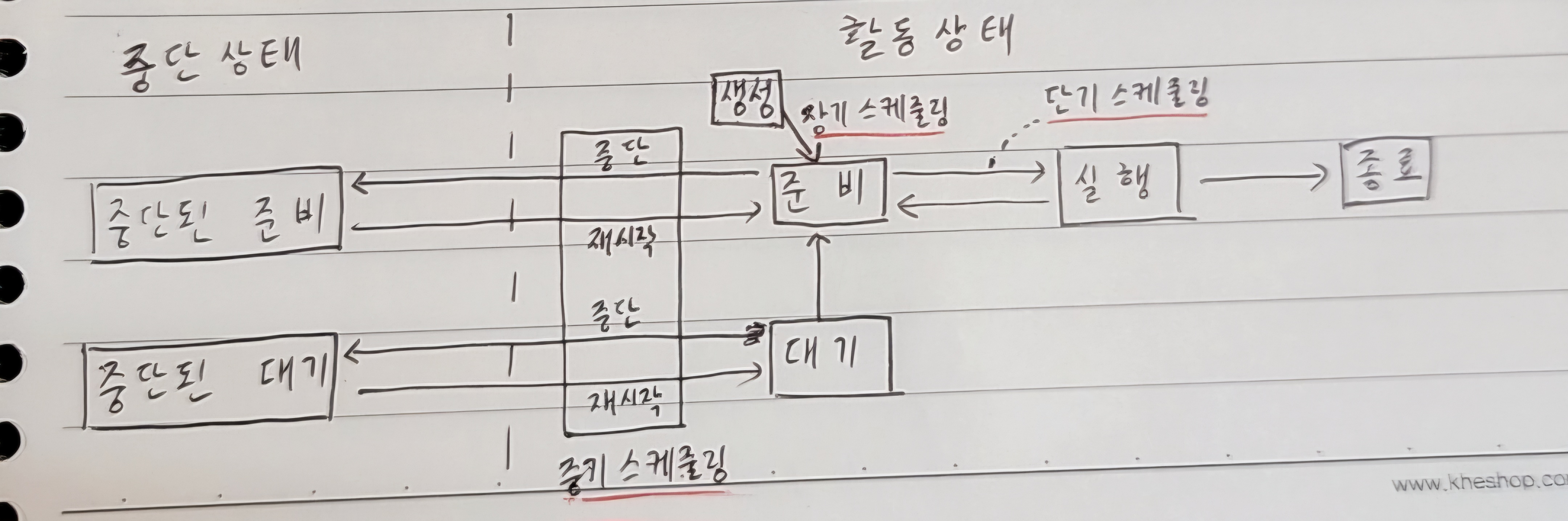 - 중기 스케줄링 : 메모리에 로드된 프로세스 수를 동적으로 조절한다. 많이 로드되면 스왑 아웃해서 일부 프로세스를 통째로 저장한다. 아웃된 프로세스는 중단 상태(suspended)가 된다. 준비 상태에서 스왑아웃 - '중단된 준비 상태', 대기 상태에서 스왑 아웃 - '중단된 대기 상태'