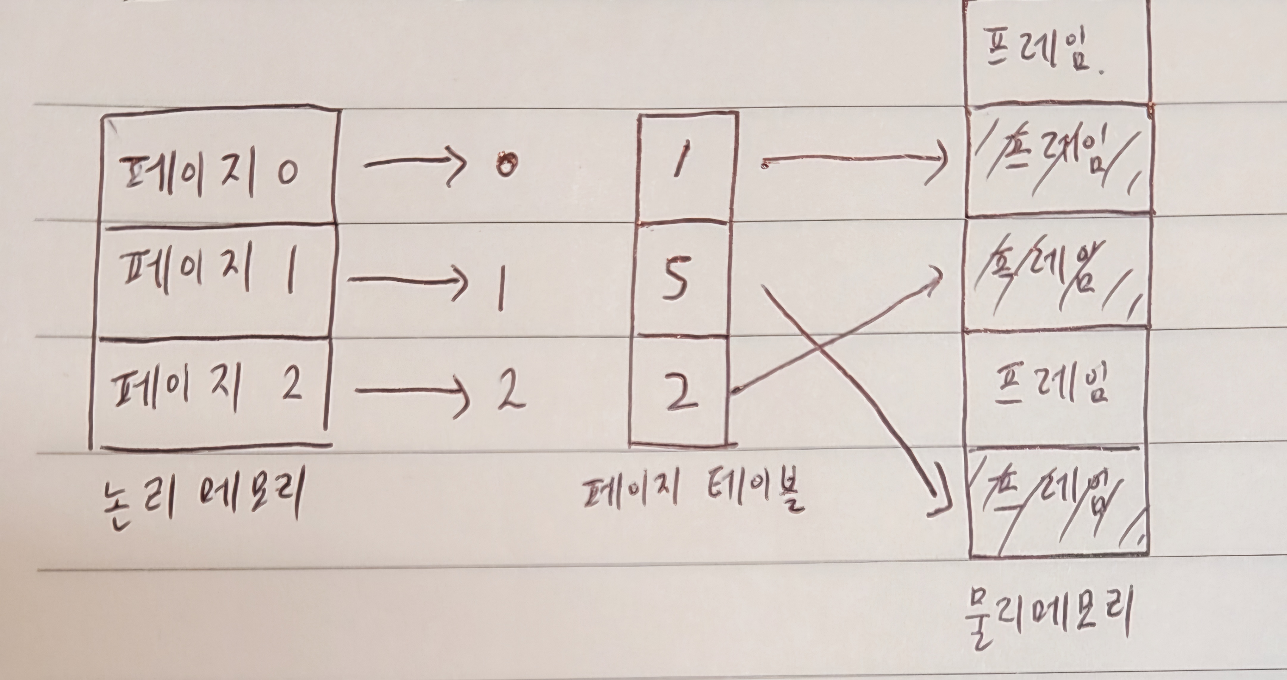 프로세스의 논리, 물리 메모리 영역을 각각 일정한 페이지와 프레임으로 동일한 크기로 나눈다.