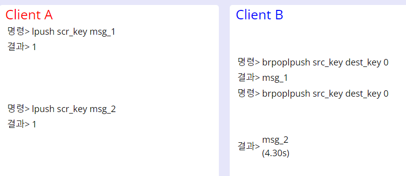 18. BRPOPLPUSH key1 key2 timeout : 대기 후 데이터 들어오면 맨끝데이터를 목적key의 왼쪽에 적재