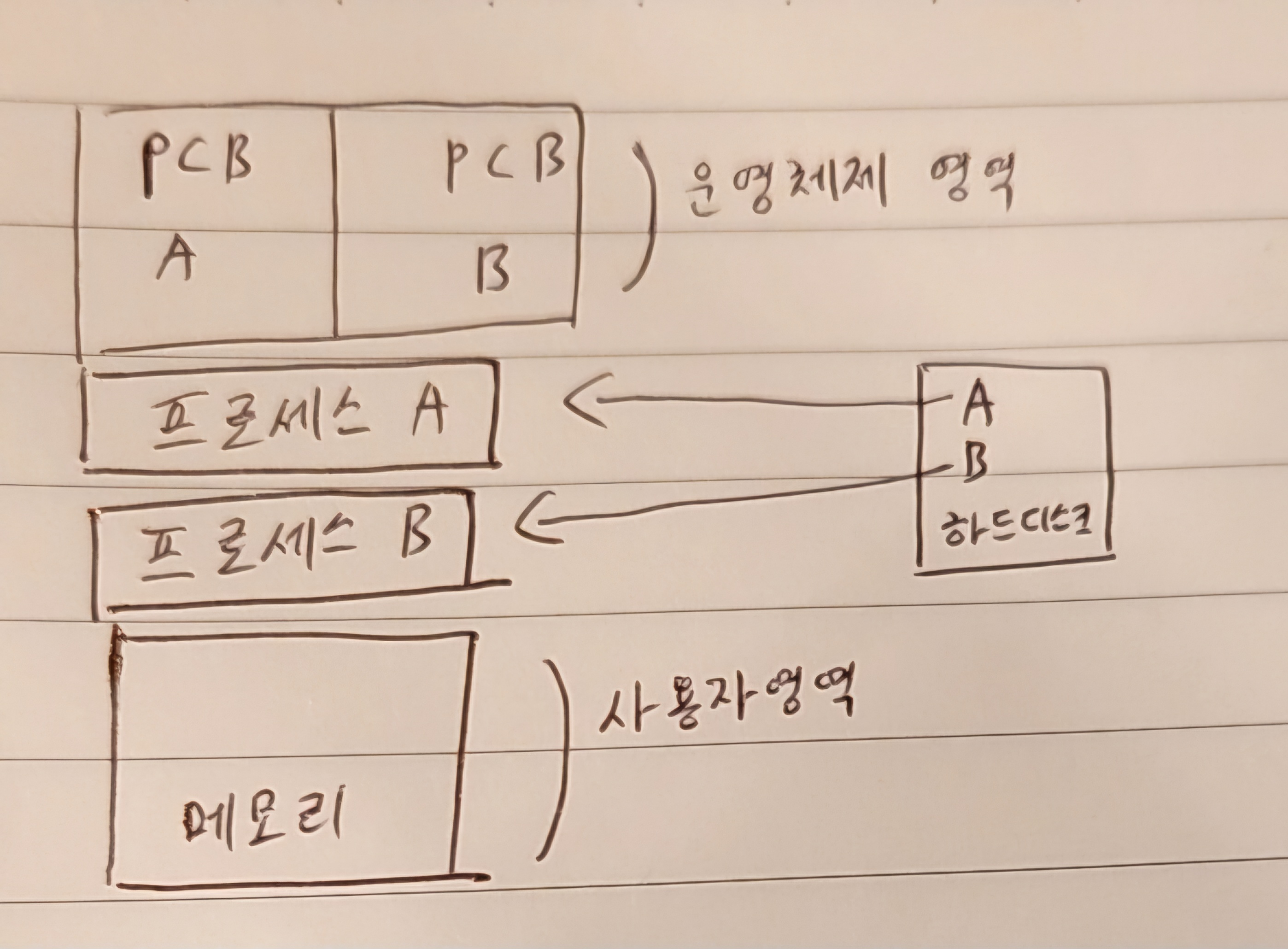 1. 메모리 계층 구조 레지스터 -> 캐시 메모리 -> RAM -> 하드디스크 (레지스터에 가까울 수록 속도빠름)2. 시스템 콜OS의 커널 모드에 접근해 프로세스에서 호출 하는 함수.프로세스 제어, 파일, 장치 조작을 수행3. 프로세스실행 중인 프로그램. 하나 이상의 스레드를 가짐.PCB에 프로세스의 현 상태, PID, 부모PID 등을 저장.프로세스마다 독립된 메모리 공간을 가짐 ( 스택, 힙, 데이터, 코드 )스택: 지역 함수, 함수의 매개변수, 반환 주소 값 저장.힙 : 동적 메모리 할당데이터 : 전역, 정적 변수, 배열, 구조체 저장. 초기화 된 데이터는 데이터영역, 초기화X데이터는 BSS에 저장.코드 : 기계어프로세스의 상태생성(new) : 프로세스가 PCB를 가지고 있지만 OS의 승인을 받기 전..